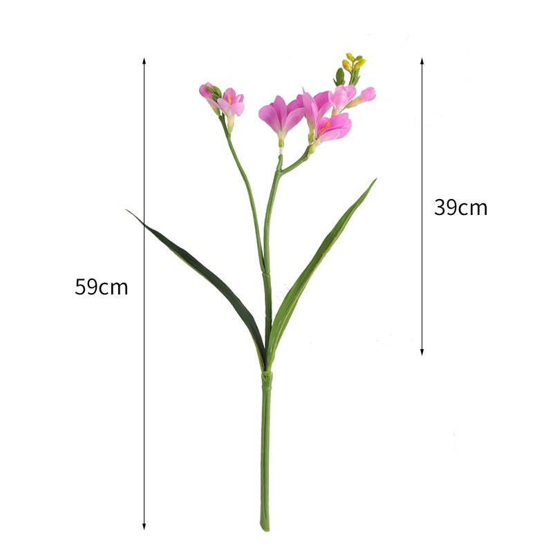 Looks just like live freesias - except they don't wilt and don't need water. Life-like size from top to bottom about 23 inches (59 cm) long | flower bloom width is about 2.4 inches (6 cm) to 3.9 inches (10 cm) (see photo).