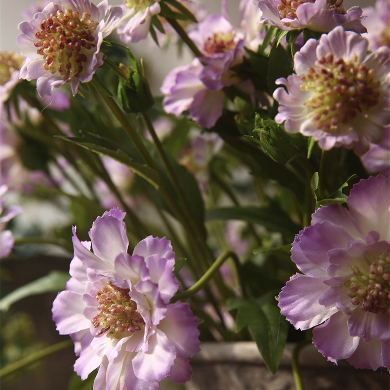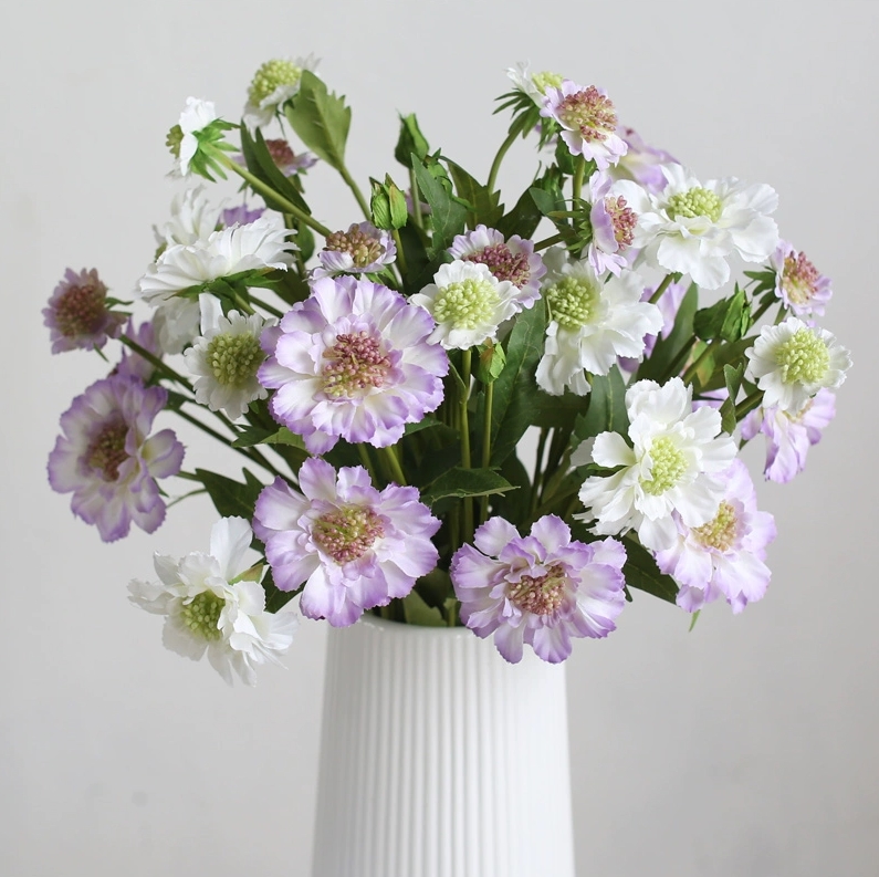 REALISTIC DESIGN: Delicately crafted silk petals with natural-looking texture and color variations, complete with detailed fluff along the faux scabiosa stems.