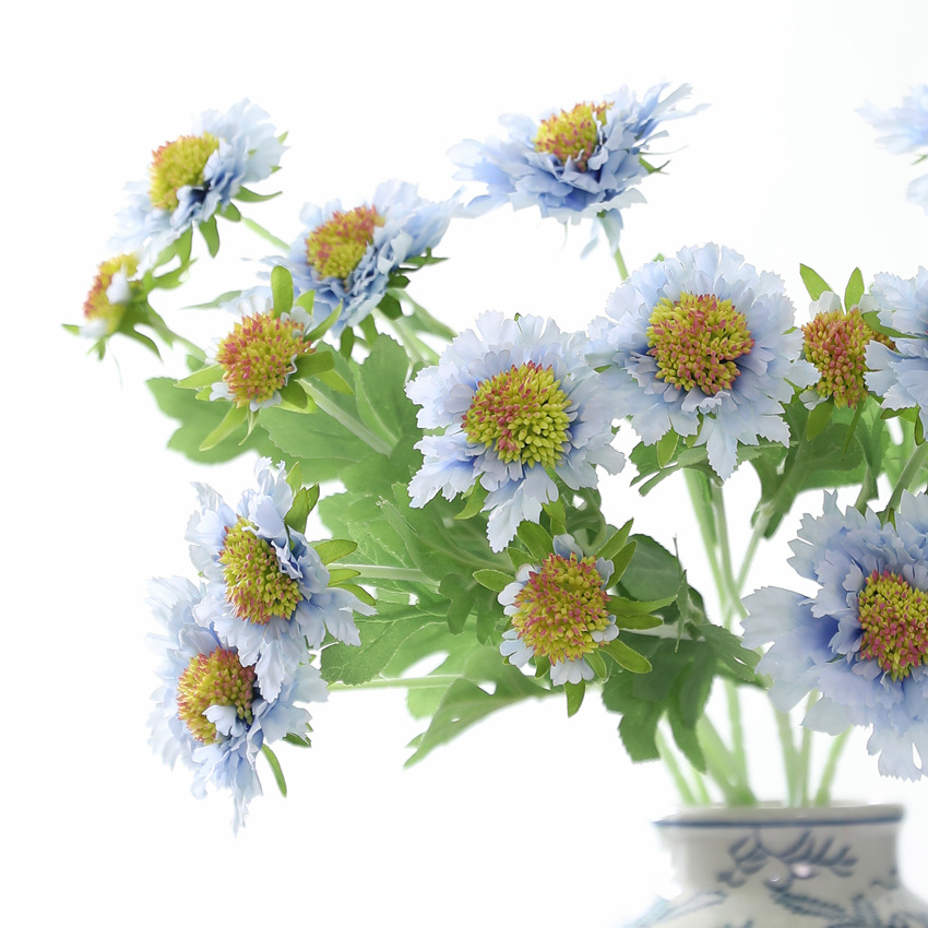 Artificial Scabiosa Flowers Long Flocking Stems with Leaves - Light Blue