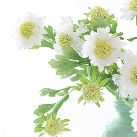Artificial Scabiosa Flowers Long Flocking Stems with Leaves - White